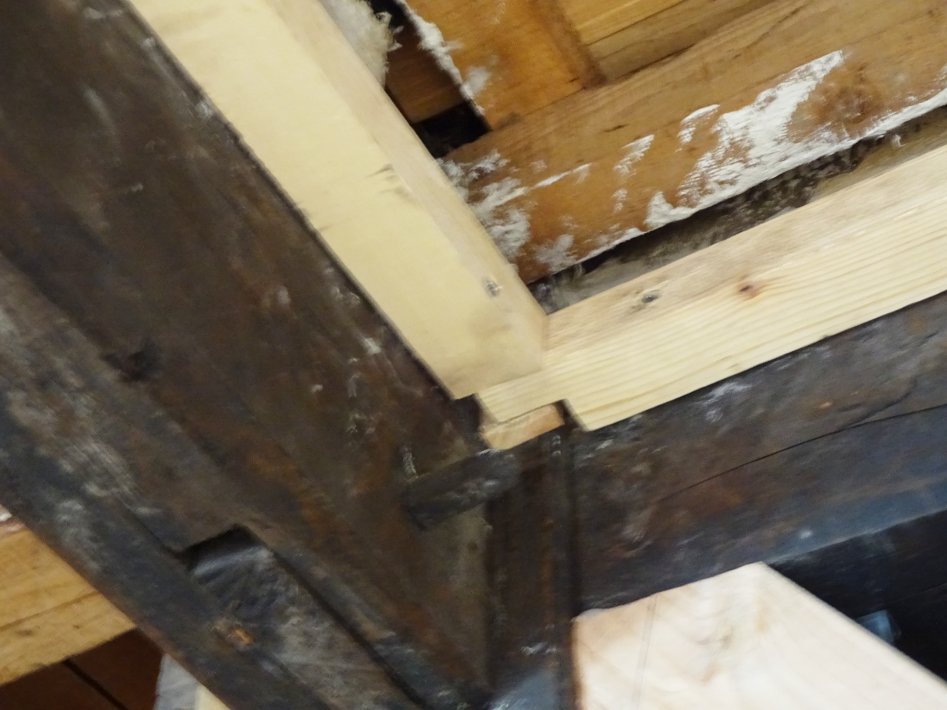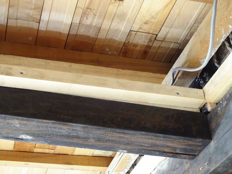 (天井と梁の写真。 梁と梁の間の斜め切りの下の方は大工さん。)
