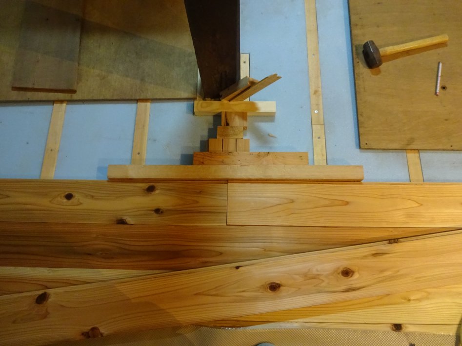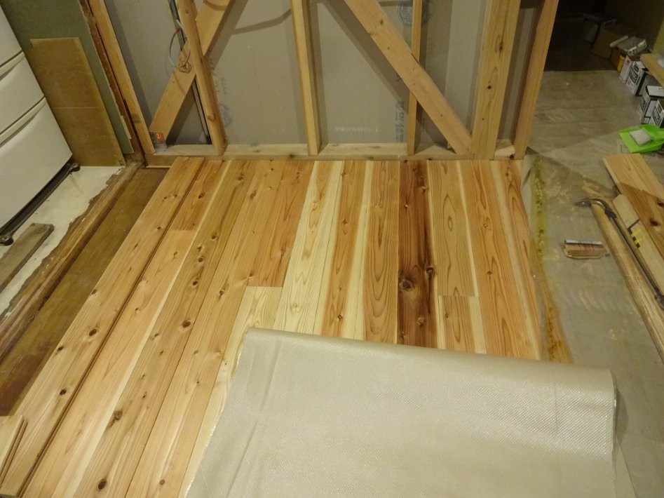 台所のフローリング張りは、最初の一枚目だけ大工さんにやってもらい、