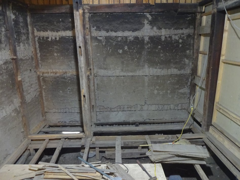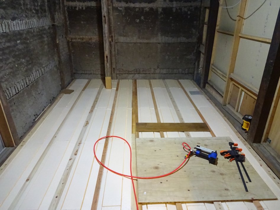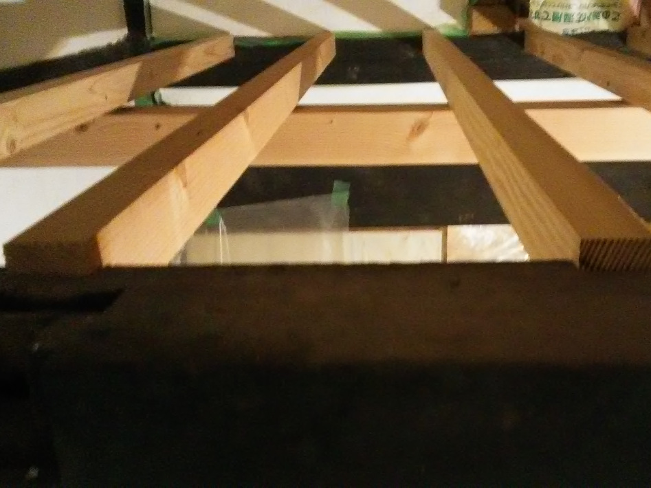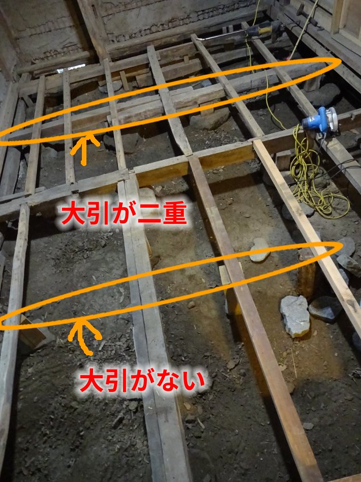 根太や大引きの少ない板の上に、ボロボロの畳、絨毯などが何重にも重なって床をつくってました。